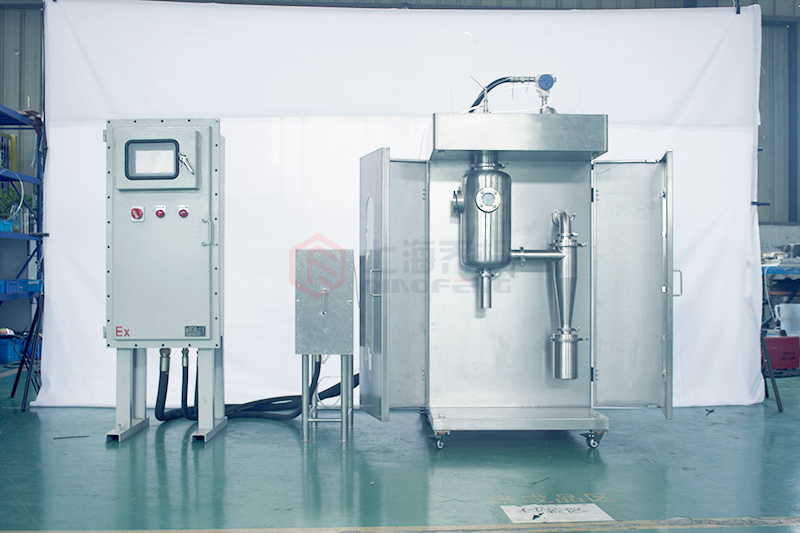 小型閉式噴霧干燥機 制藥專用 防爆級,裝置特別針對于有機溶劑,以使用循環氮氣而形成的惰性氣體介質取代通常的空氣介質,來進行噴霧干燥。除了能回收產品之外,尚可回收有機溶劑。針對有機溶劑低閃點或者微毒的特點,易燃易爆的特點特別設計該套閉式循環噴霧系統。