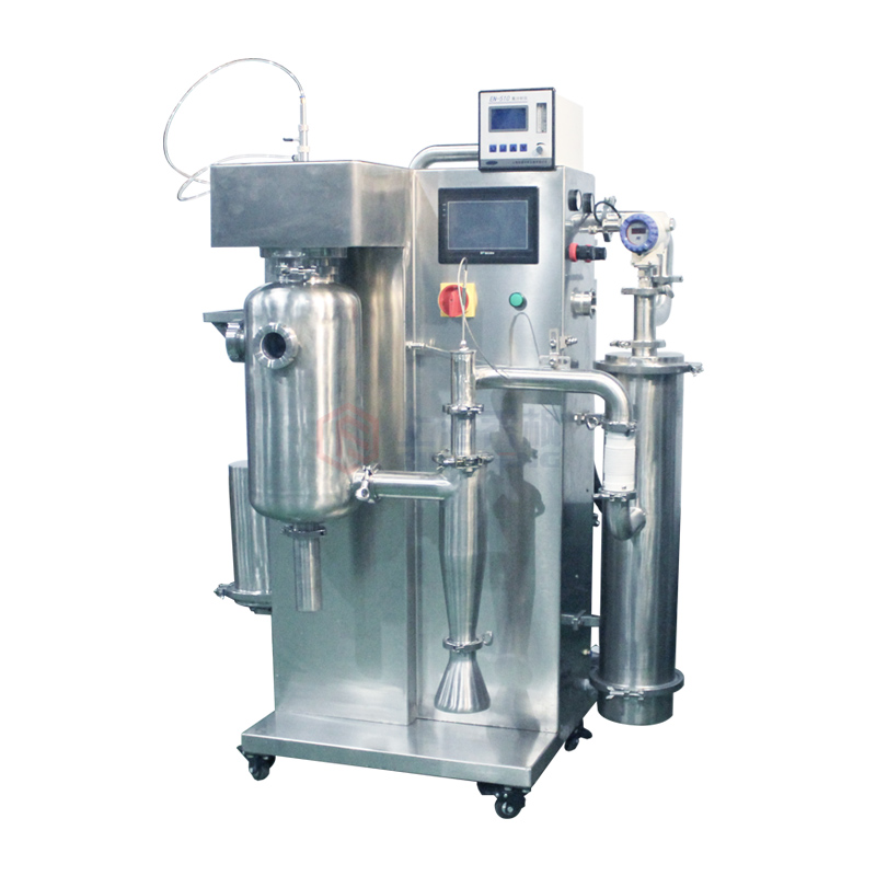 設備主要由:送料系統、加熱系統、霧化系統、噴霧干燥系統、惰性氣體循環系統、產品回收系統、冷凝系統組成。